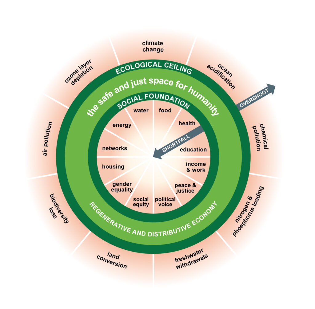 人類は、この二つの輪の間の「ドーナツの内側」で生きるべきであり、どちらかを超えれば危機が訪れるという考え方です。